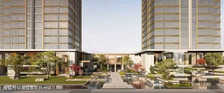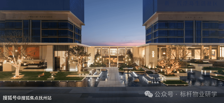 项目将大面水景置于社区前场,结合绿植、流瀑、雕塑等,构筑了令人印象深刻的入口界面。