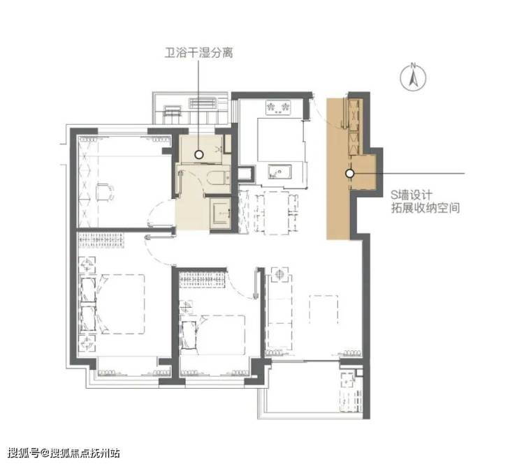 更值得一提的是建筑面积约89平方米户型“S墙创新设计”,为相邻两户创造出了额外的凹槽空间,扩展了收纳。将冰箱塞入这个凹槽,释放厨房的冰箱空间,延伸灶台面积,或者可以做岛台……让小户型不在受收纳空间的支配;