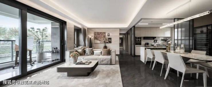 餐客厅弧形吊顶,柔和空间的边界,更带来视觉的延伸,增强空间的通透感,让空间更显明朗。与主卧配置的智慧灯光系统联动,让光线营造不同场景下的居家氛围感。