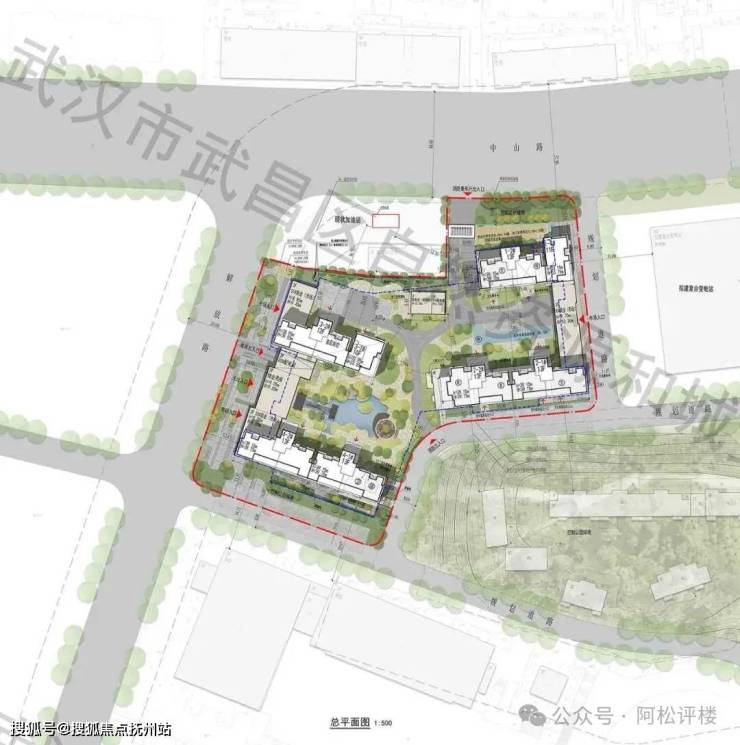项目体量比较小,从平面图来看,1号楼1单元、3号楼1单元可能为非常罕见的1梯1户结构,其他单元可能均为1梯2户或2梯2户纯板楼结构。3、4号楼之间规划有水景,3号楼2单元首层架空。临中山路一侧为防护绿地。
