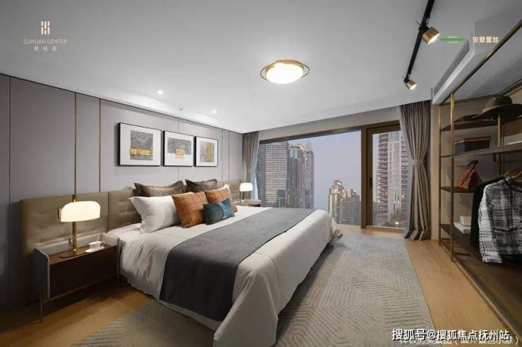 主卧中,4.2米的开间,配上1.8米的双人大床,小而精的梳妆台、衣柜都不会显得拥挤。特别值得一提的是,南北两个卧室,都带有全景落地窗,南侧拥公园美景入户。