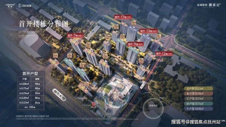 占地面积:共6.23万方,建筑面积:共22.18万方,共17幢,总户数:847,70年产权,住宅层高:3.1米,1300㎡酒店式泛会所恒温泳池,绿化率:35%,容积率:2.5,外立面:大面晶钻玻璃幕墙+收边铝板线条,户型面积:113㎡、139㎡、174㎡、175㎡、208㎡,物业公司:龙湖物业,物业费用:5.5元/㎡/月,车位配比:1:1.2,交付时间:预计2026年4月30日楼幢