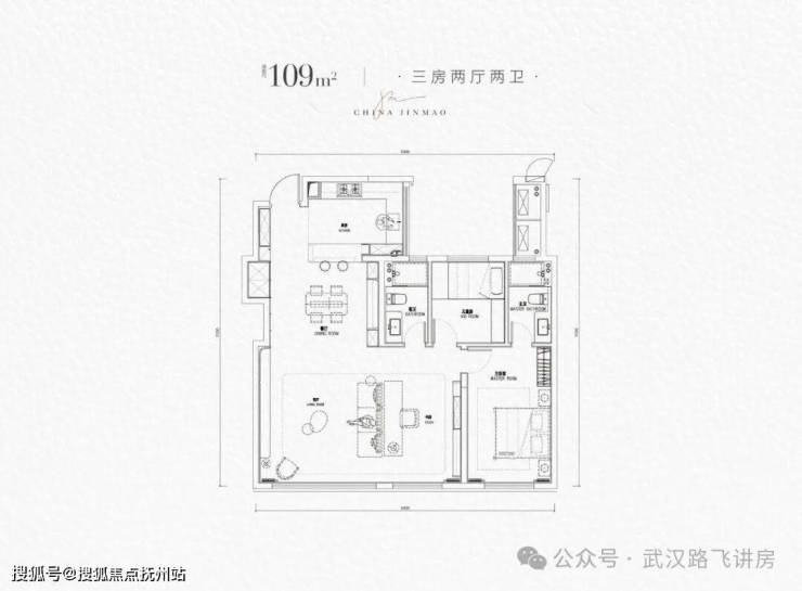 ①109㎡户型:三房两厅两卫,三开间朝南,动静分离。45㎡的LDK一体化公区设计,南向10.9米面宽,7.6米宽景客厅,95.8%的实际得房率。