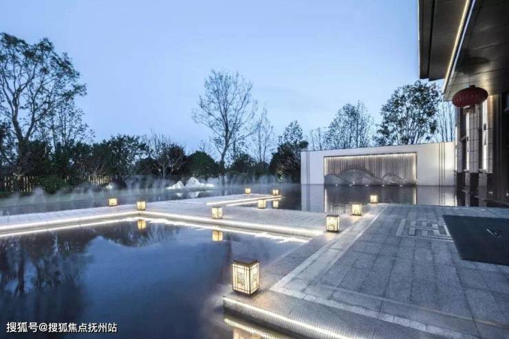 林荫花境的出口,薄雾缭绕,拨开云雾,一派山水府苑的尊荣气度展现开来。销售中心前,景观设计结合项目案名中的关键字“澜”,在前场打造富有张力的巨幅镜面水,抽象转译出的璧山景墙,围合的层次绿植,相映的轻幽白云,凌水铺挑的折道共同营造出“云水共一色,人在镜中游”的情境氛围。