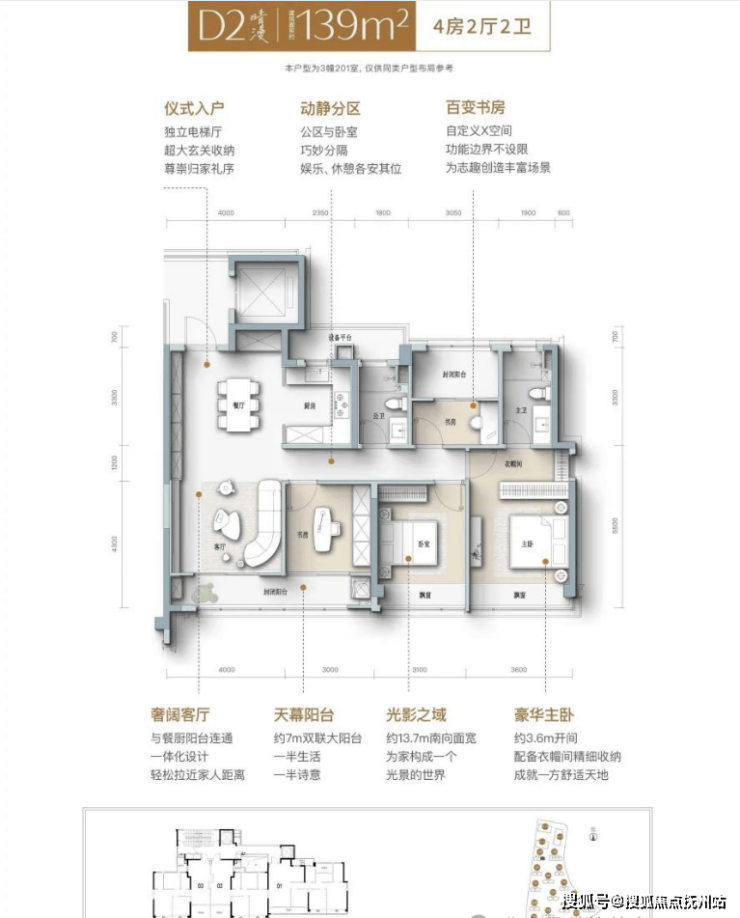 建筑面积139㎡户型,约13.8米四开间朝南,沐浴阳光,温馨满屋,共筑全家人的温暖时光。尊享仪式入门,独立电梯前厅,超大玄关,收纳无忧,彰显归家尊贵礼仪。宽敞竖厅,客餐厨一体化设计,空间进深达10米,聚会娱乐,从容自在。多功能书房,自定义空间,无限可能,打造个性化生活场景。豪华主卧,约3.6米宽敞面宽,设施完备,赋予生活更多精彩。宽阔景观阳台,休闲与实用空间巧妙分区,趣味与舒适并重。