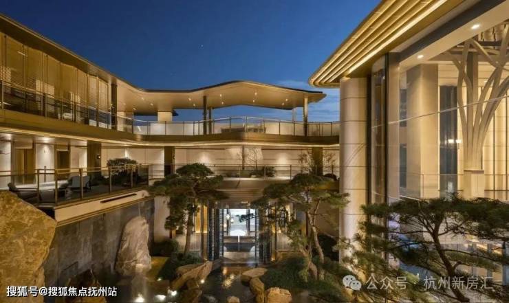 约43米恢弘门庭两侧黑松耸立,挑高约12米的归家大堂洒下尊崇感,钱塘江潮涌的曲线凝固在露台边缘,星河触手可及。