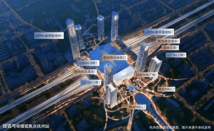高度约399.8米“金钥匙”综合体,建成时将成为杭州第一高楼;高度约320米的“金手指”综合体建成时将成为杭州第二高楼,目前四幢高楼皆已突破200米大关,CD塔楼已封顶;