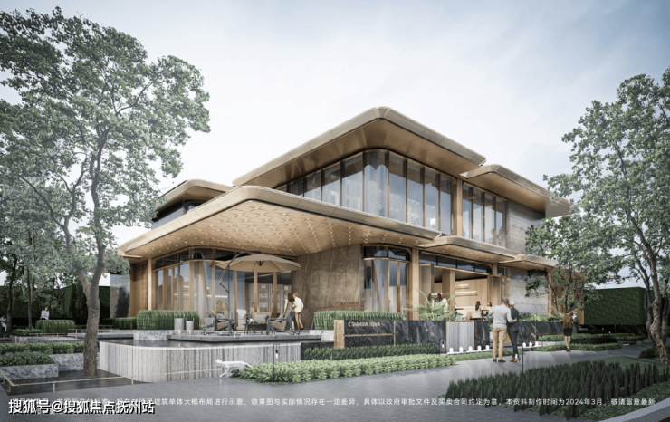 第一重——酒店式环道落客、现代精奢大堂、悬廊叠瀑水岸会客厅,移步异景,漫游归家入户;