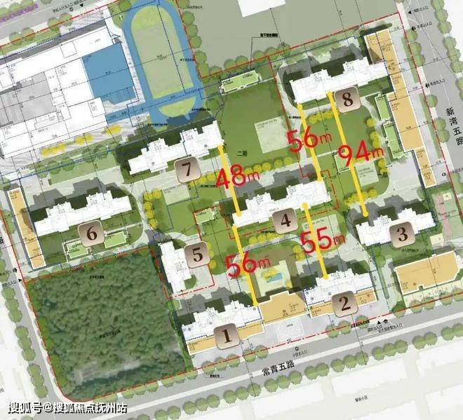 第一,10栋调整为8栋:通过优化楼栋布局,将最大楼间距拉至约94米,既能保障住户的日照采光,也为社区园林留出更大空间尺度。