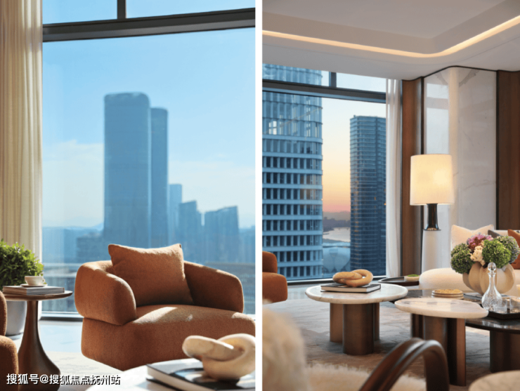客厅是约18m的看江面,(建面约)160㎡的餐客厅,270度落地窗外,是杭州之门、莲花碗、国际博览中心,这座城市最耀眼的心跳,与你一起闪耀。