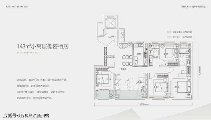 首开的143㎡小高层户型,四房两厅两卫,南向面宽高达15.3米;四开间朝南,客厅开间约5.4米;阳台进深约2.1米,双阳台再加上全赠送的飘窗,优化后得房率约95%,如果再加上约6.6㎡的电梯前室,得房率高达99%。