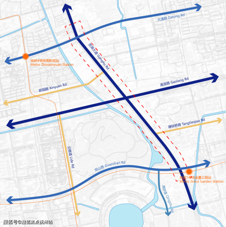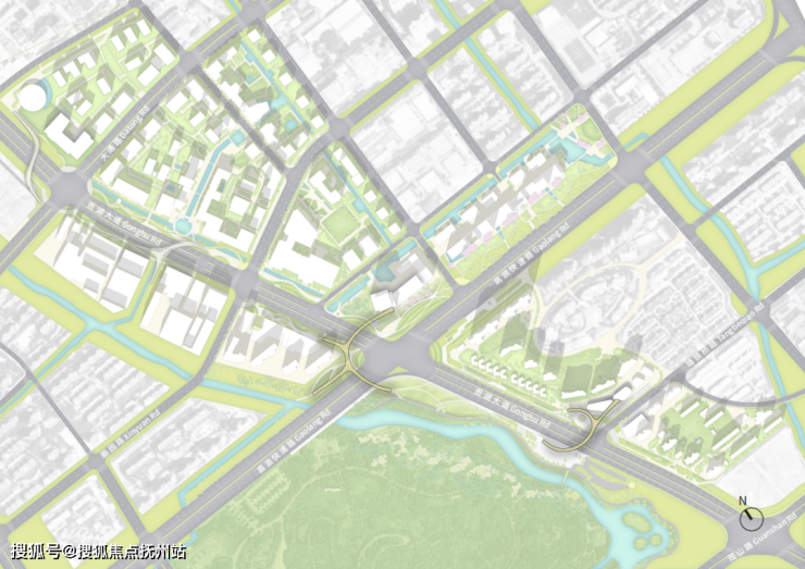 道路整体贯穿多种城市功能区:住宅、商业、景观等,人流较大,因此需要更加安全便利的,穿行贡湖大道的路径。