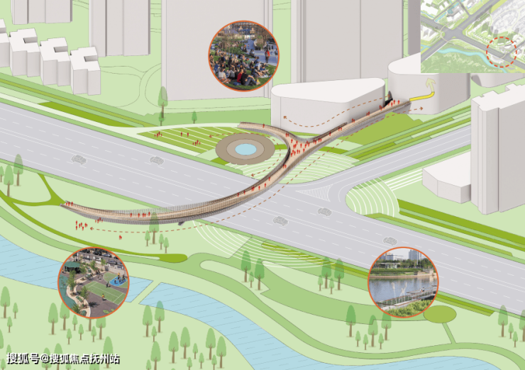 项目结合当地景观、市政绿带、社区活动空间等场地的不同特点,对人行天桥进行了整体规划,并以景观南段作为天桥的核心位置。