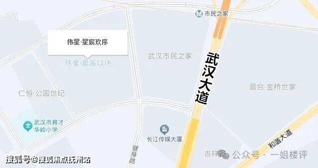 伟星星宸玖序项目位于江岸区健康街与健身路交汇处,东边紧邻武汉市民之家、武汉大道。