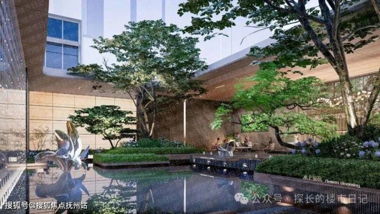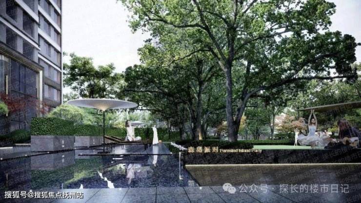 中心区域设有镜面水景、浮岛树池及下沉卡座,形成户外社交空间;绕水景而行可抵达约320㎡的草坪,草坪三面环水,可供休憩或活动。