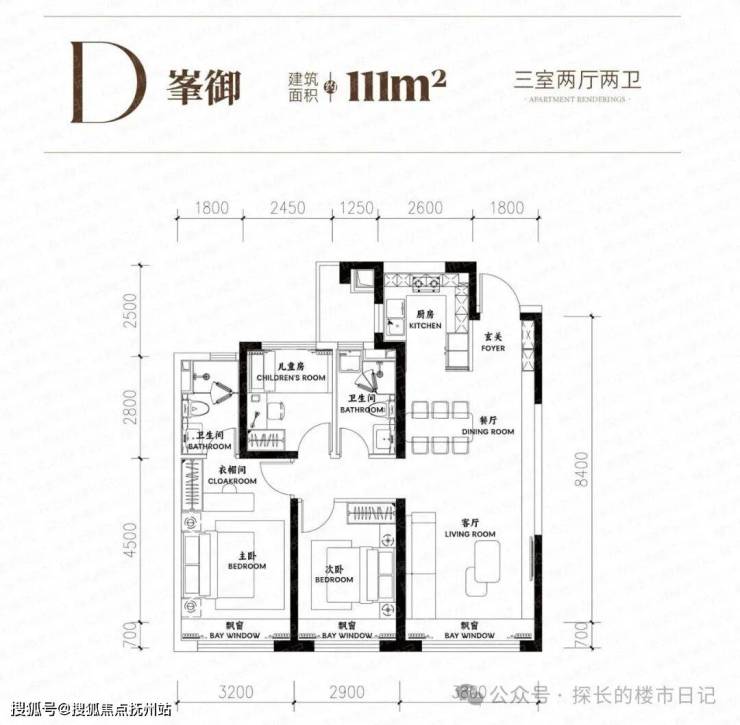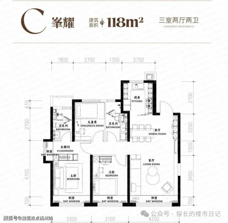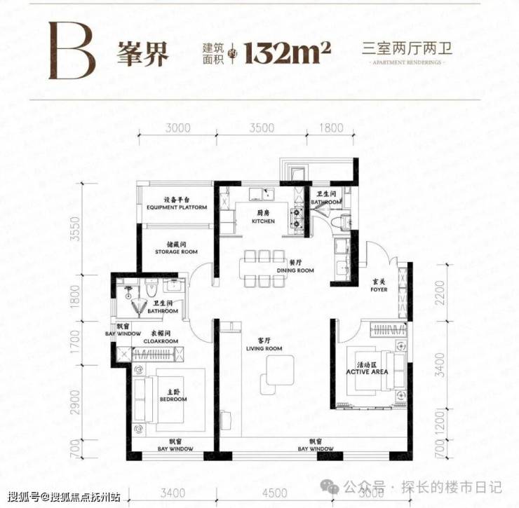 客餐厅面宽4.5米,与厨房连通,形成开放式活动空间;主卧套房配备衣帽间、飘窗及独立卫生间,生活更加注重私密性;