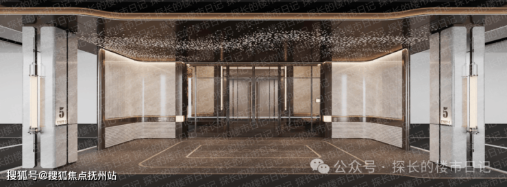 地下车库入口设半围合式落客区,顶面是星空顶造型,搭配独立地面铺装,呈现酒店式落客区的观感。