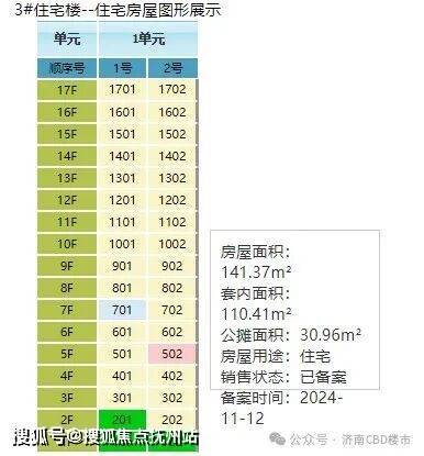 3号楼:17层(两梯两户),143平,公摊21.9%