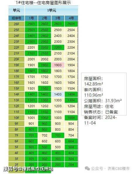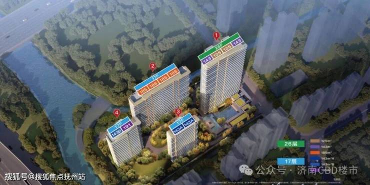 1号楼:26层(两梯四户),143平+125平,公摊22.35%