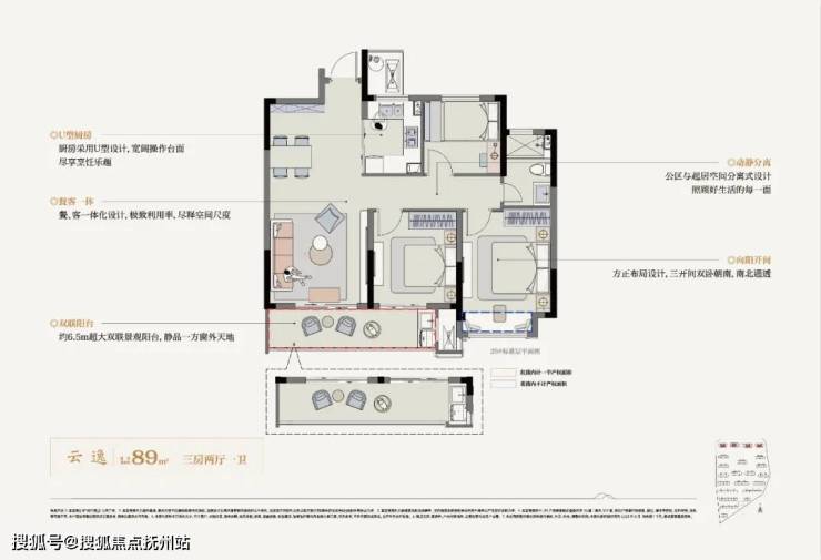 极具实用性的89方户型:公区与起居空间分离式设计照顾好生活的每一面;方正布局设计,三开间双卧朝南,南北通透;餐、客一体化设计,极致利用率,尽释空间尺度;约6.5m超大双联景观阳台,静品一方窗外天地;厨房采用U型设计,宽阔操作台面尽享烹饪乐趣。