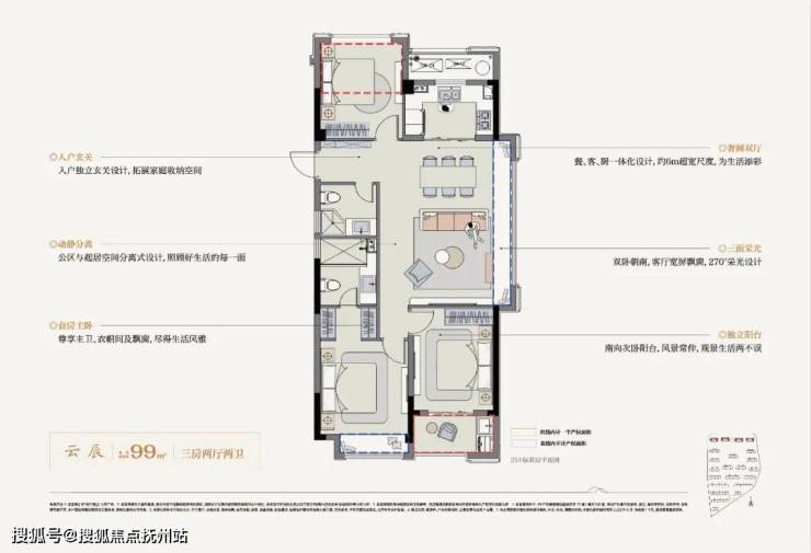 超大侧厅的99方户型:入户独立玄关设计,拓展家庭收纳空间;公区与起居空间分离式设计,照顾好生活的每一面;尊享主卫、衣帽间及飘窗,尽得生活风雅;餐、客、厨一体化设计,约6m超宽尺度,为生活添彩;双卧朝南,客厅宽屏飘窗,270°采光设计;南向次卧阳台,风景常伴,观景生活两不误。