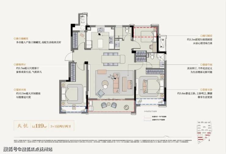 接受度最高的119方户型:多功能入户独立储藏室,高配生活收纳美好;约5.7m超大尺度客厅,宴客或是生活,气度非凡;约12.5m超大开间朝南,尽揽奢适尺度;约3.3m面宽行政级厨房,从容心情美味自来;灵动客厅,个性化自定义,约3.6m奢适主卧,主卧明卫、飘窗,尊享生活宽景为生活增添无限可能。