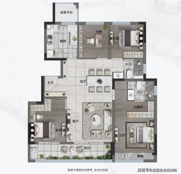 更让人惊艳的是卧室,三个朝南卧室都自带飘窗。其中东西两侧构成双主卧设计。