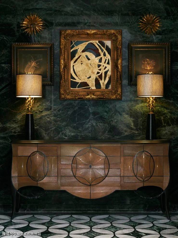 步入玄关,灵感源于老宅花窗的拼花地板、精巧的手工雕塑台灯,以稀有珍珠鱼皮密拼的玄关柜相互映衬,暗喻“传世与权力”深祖母绿墙面,奠定宅邸幽深奢华的基调和仪式感,彰显“老钱”的传世气派。