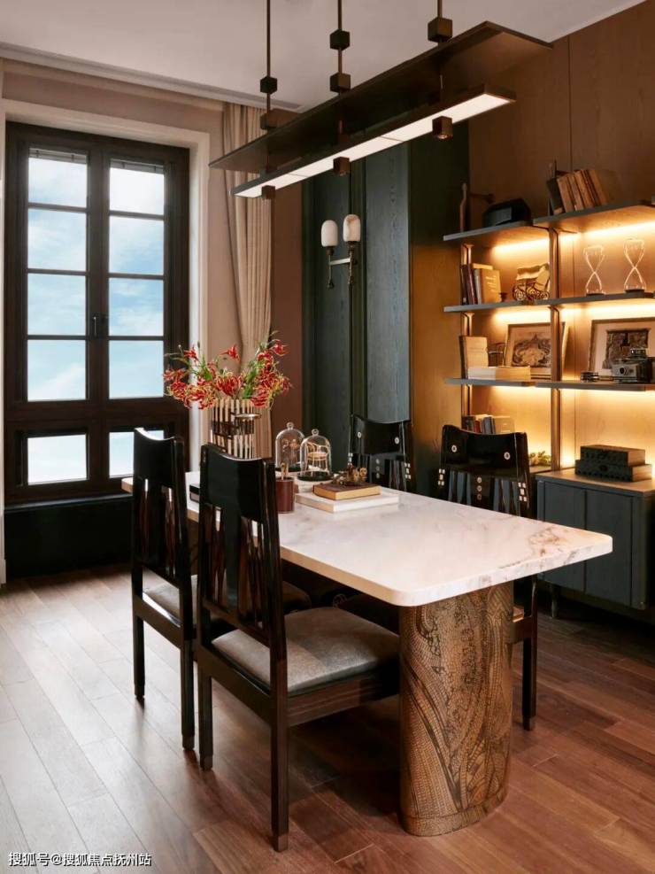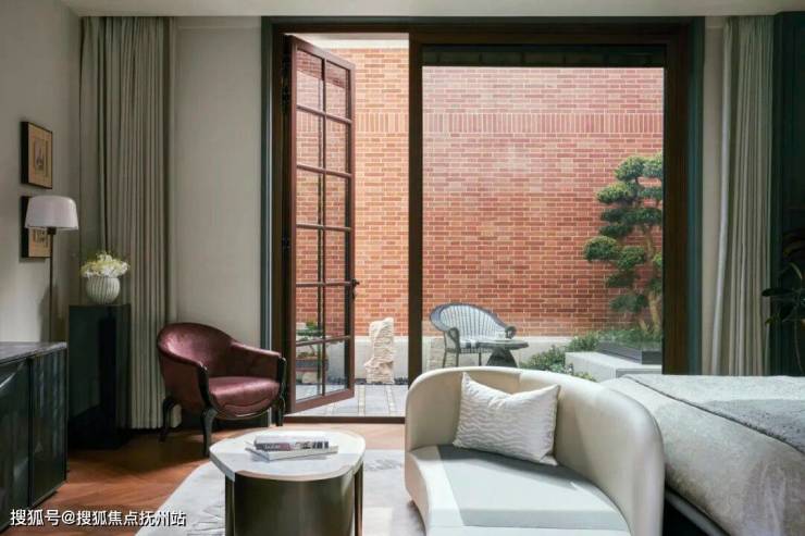 穿过一扇映照着摇曳树影的砖砌拱门,从中庭步入通向别墅区,眼前的大宅铺陈出一室典雅深沉。禅意园景、素雅石墙、朦胧灯影,饱含底蕴的装饰艺术风格和锐意的现代设计碰撞出耐人寻味的动态平衡,同时传达出融贯古今东西的折衷风格。