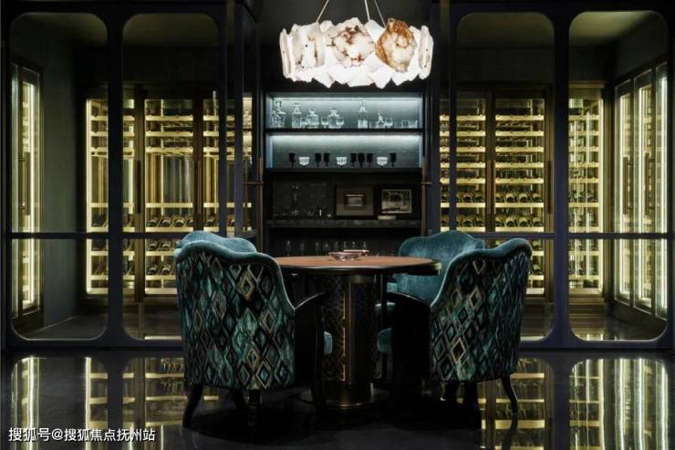 地下二层是男主人基于欧洲古堡酒窖而设的雪茄藏酒窖,一面拱形窗依次排开,透露出妥帖的序列感。恒温酒柜珍藏着主人年份上佳的藏酒,孔雀绿色刺绣丝绒椅背勾勒出圆融流动的线条,酒柜散发出幽绿色光芒映衬着光洁的镜面地砖,模糊的边界和清晰的轮廓相呼应,这里如同一方纽带,连接生活空间与精神场域,袅袅婷婷的雪茄烟雾缭绕指尖、宝石般剔透的酒体在杯中散发丰富香气,缱绻悦动的爵士在空间里流动,在宁静致远的私享或待客时光里,赋予家宅“传承”的价值。