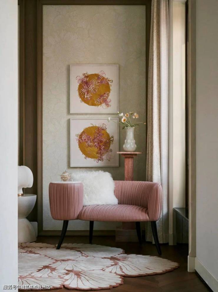 顺着步梯向上,空间从沉稳庄重过渡至到更轻盈谦逊的用色,又像在时光里穿行,既藏有深沉的东方美学、又融合西方现代审美。不动声色的建筑匠艺贯穿其中,彰显大宅“传世”风范。通透豁亮的小客厅被设置在孩子房与主卧之间,边柜条案古朴典雅,镂空椅背庄重华丽、一张宛如水墨晕染的坐凳伫立其中,唤醒记忆中东方朦胧的表达。