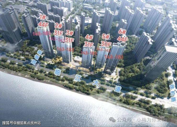 该项目规划有6栋楼,临江一字型排开,全部一线临江,每栋住宅都有不错的观江面。栋栋正观江,前排无遮挡。其中2栋超高层、4栋高层,整体规划定位为改善。项目总建面约8.97万方,项目容积率2.49,总户数约402户,住宅机动车停车位约431个。该项目的人行主入口就在临江大道沿线,在3、4号楼中间,还规划了下沉庭院,而且每栋楼之间有风雨连廊连接,规划有绿化架空层和5个景观小组团组合而成。