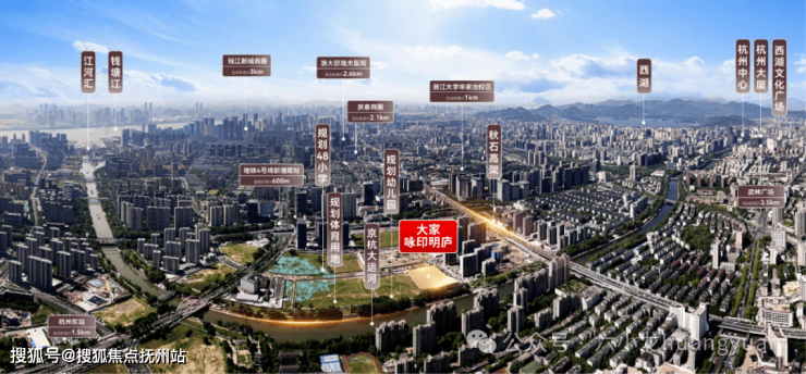 大家·咏印明庐坐落于杭州安琪儿板块核心区,北临京杭大运河,南接华润元起观潮府,是杭州首个全抬高设计(整体抬高约12米)的高端住宅项目