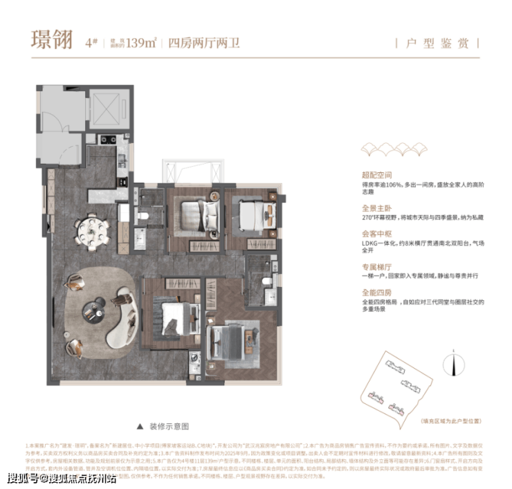 该户型为2、4号楼端头边户,南北通透,三开间朝南,结构相对常规。带独立电梯前室,且电梯前室还做了一道门进行隔离。建面约139平可以做四房,功能性比较强。亮点是主卧全景舱两面拐角飘窗,优化面积多,采光比较好,不过床就不太好摆了,得对着主卧门口。