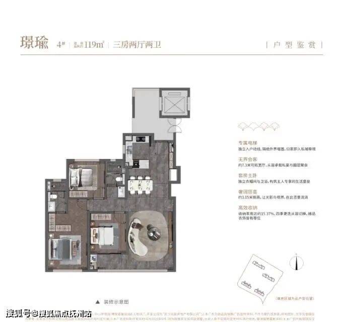 该户型带独立电梯前室,两个卧室能做到270° 景观视野,大概率也是双面飘窗。不过,南向次卧卫生间是暗房,南向次卧外有空调机位,按照户型图显示会一定程度遮挡采光(实际情况待定),餐厅位于户型中部,采光较弱。