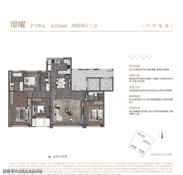 建面约166平,四房两厅三卫: