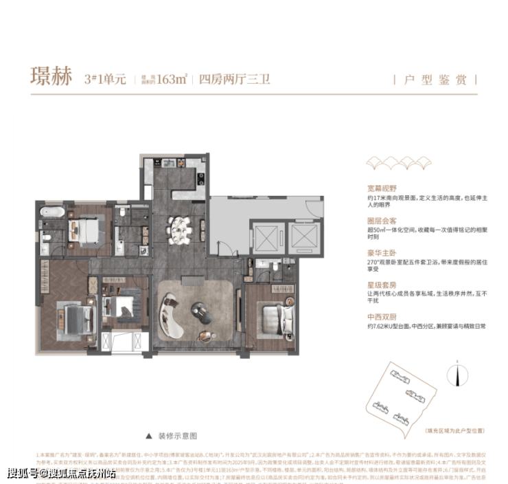 建面约163平,四房两厅三卫:
