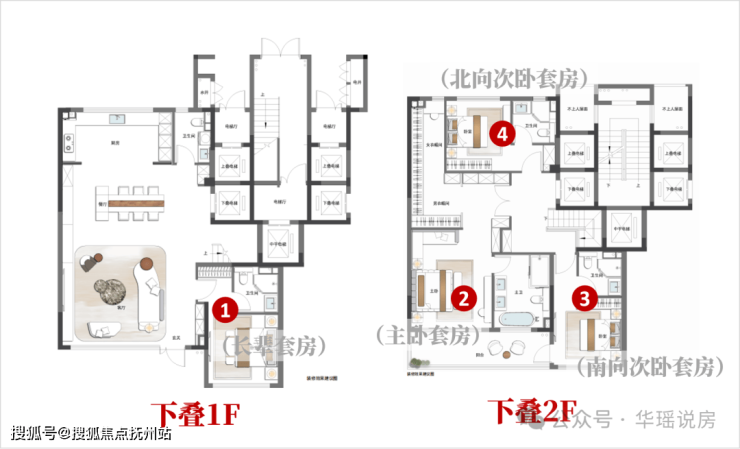 下叠首层是LDKG一体化的设计,南向套房,可以做老人房;二层休息区同样精彩,除了3大套房的配置,亮眼之处在于这个主卧套房,南向连接阳台,北向嵌套超大衣帽间,让生活场景相当完备~