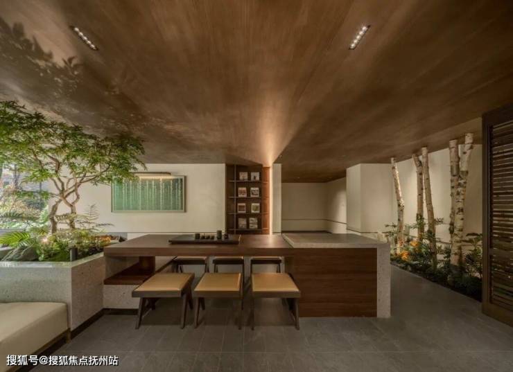涌泉水景不动声色地漾开汀兰水院的松弛感。睡莲在静水之中安然酣睡,阳光在绿叶上晶莹跳跃。大叶热带植物的掩映下,柔软的临水休憩之地,值得去慢慢消磨时光。