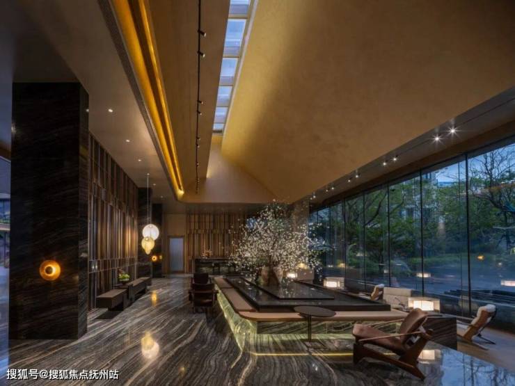 作为社区最大的盒子空间,礼仪盒子(东门)是重要的会客场域。流云水域和社区里的幽林漫境温柔地连接,金属线条、翡翠墙面、落地玻璃、木饰地板以最恰当的方式组合运用,植物、阳光、清风与通透的空间自然融合,迎接每一位业主归家。