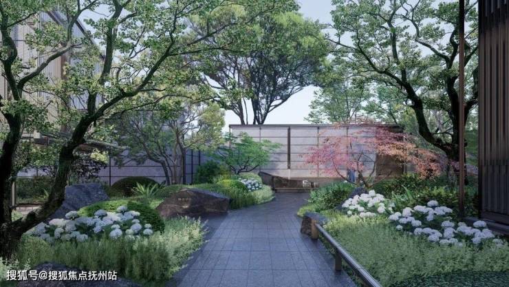 一条清韵石径,挑选造型独特的石头、三两组合成景,搭配特选的造型植物,极具艺术美感。而清泉石流景墙背后,就是未来业主的生活区。