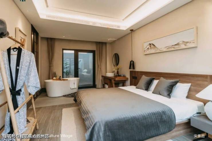 在联排和合院的套房主卧中,多分式盥洗间,配备浴缸区和淋浴区,全落地玻璃观景效果,让人仿佛酣睡于自然怀抱之中,安谧无虞。