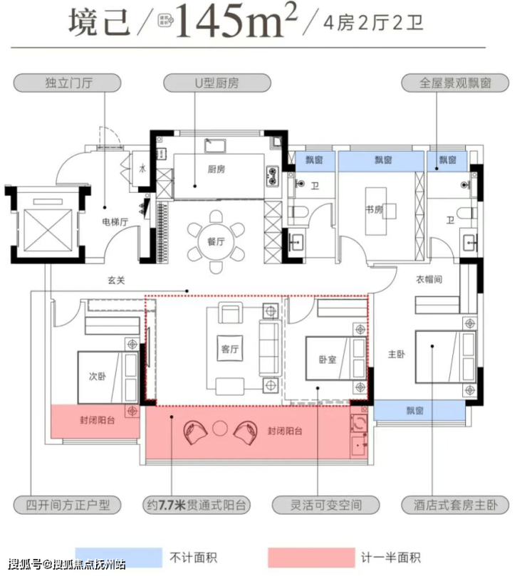 145㎡墅区洋房:四开间朝南,双联阳台封闭交付,赠送12㎡可变空间,65%业主规划为12人烧烤区;U型厨房配备中西导台,满足多元烹饪需求。