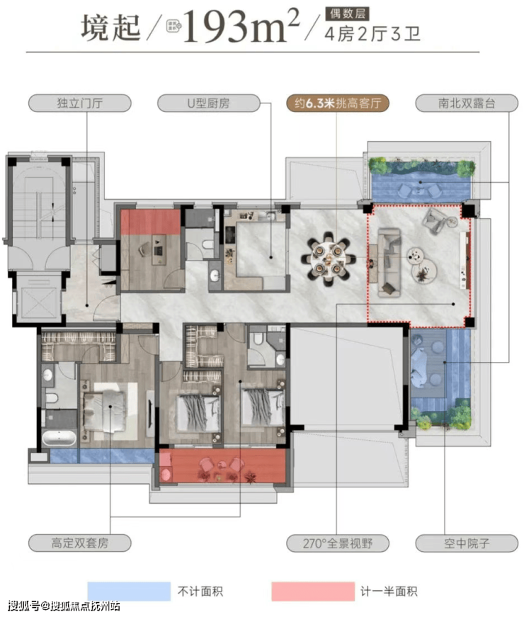 193㎡跃级四代宅:LDK一体化墅厅挑高6.3米,南北双露台形成270°环幕视野,奇偶层错位布局避免对视,实测晾晒垂直距离超8米;主卧套房配备双台盆、浴缸与步入式衣帽间,空间媲美五星酒店。