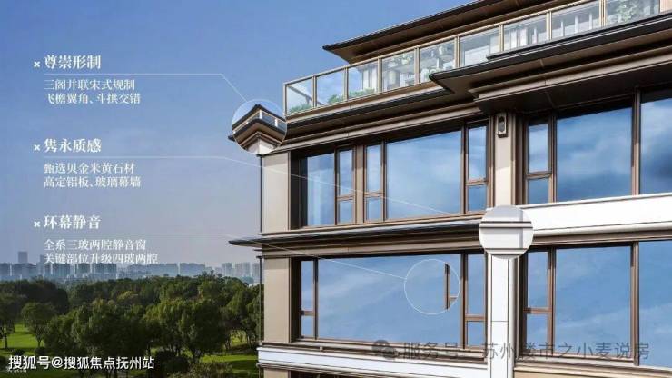 循宋代楼阁之精妙甄选米黄石材、金属铝板与玻璃幕墙,以“三阁并联”的形制飞檐翼角、层级叠退,诠释宋氏清雅风骨。定制系统门窗南侧首排以四玻两腔的高标准,成就无界环幕传统与当代共生共绎,重构姑苏美学天际线。