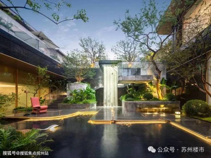 约5米高悬挑飞瀑添灵动,搭配羽毛枫等多层次绿化与镜面树池错层平台,完全跳出传统改善盘的堆叠感,有种在酒店度假的松驰感。