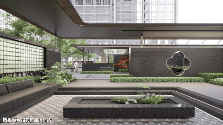 ▷地面「水梦天地」:西班牙油橄榄+日本羽毛枫,浅表水景倒映千年古城