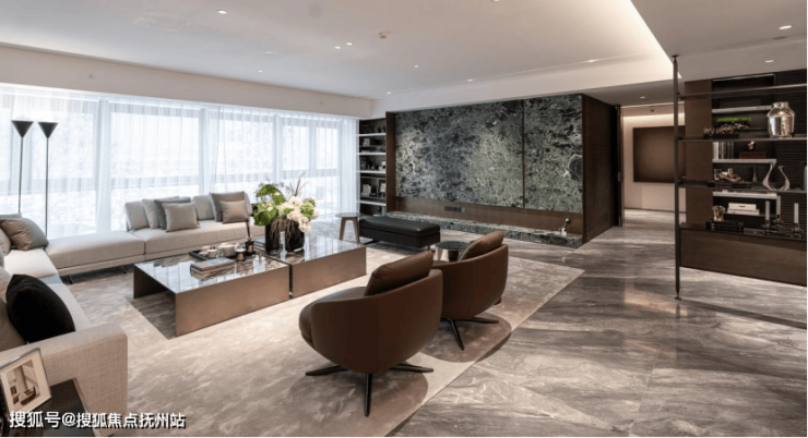 普拉达绿奢石+威尼斯棕:客餐厅通铺天然石材,连121㎡入门户型都标配劳芬卫浴、美诺厨电。