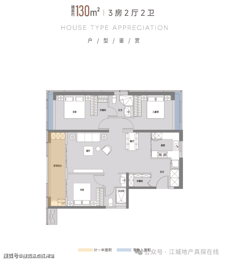 建面约130㎡户型(三房两厅两卫)