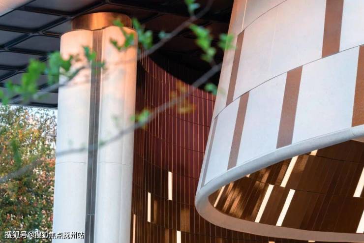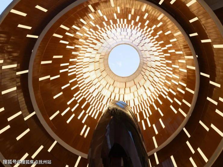 “悬浮式大屋顶 + 核心筒状元素” 的组合造型,大屋顶以流畅的曲线形态横向延展,形成强烈的视觉张力,核心筒则以圆形嵌套结构纵向聚焦,两者一纵一横、一虚一实,构建出极具标志性的立面造型,使建筑在城市界面中具有极高的识别度。